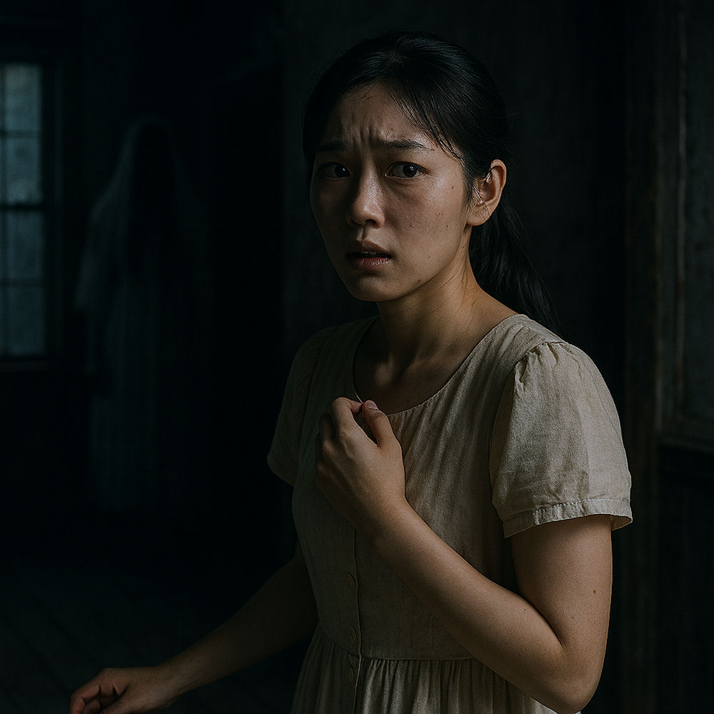 薄暗いボロボロの家で、誰もいない、幽霊が出てきそうな家の中に入っていく。