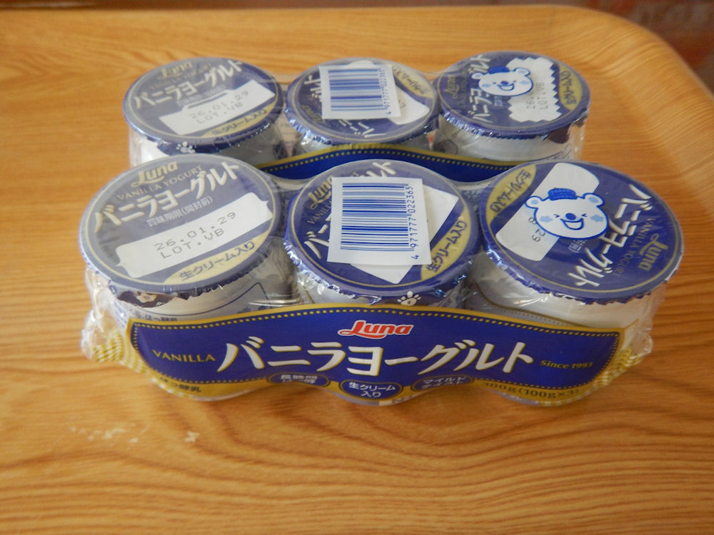 日本ルナ「バニラヨーグルト」。3個入りを2っ買いました。賞味期限が1月29日とは言え、2っは買い過ぎ?