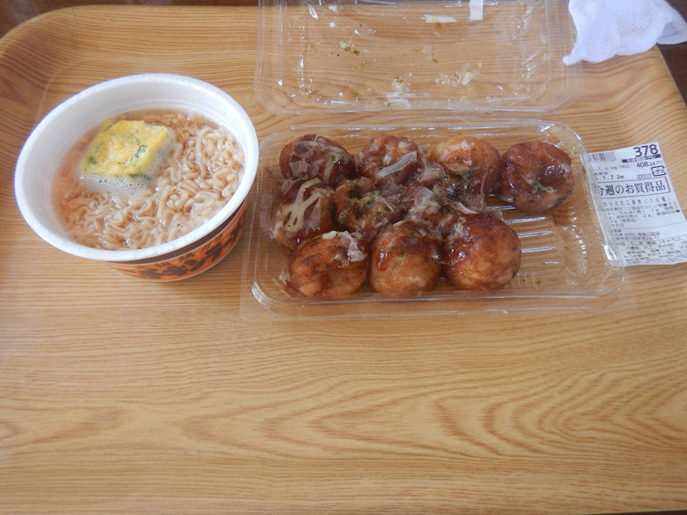 今日の昼食は、シャトレーゼに行った帰りにスーパーで買って来た、たこ焼きと、チキンラーメン。